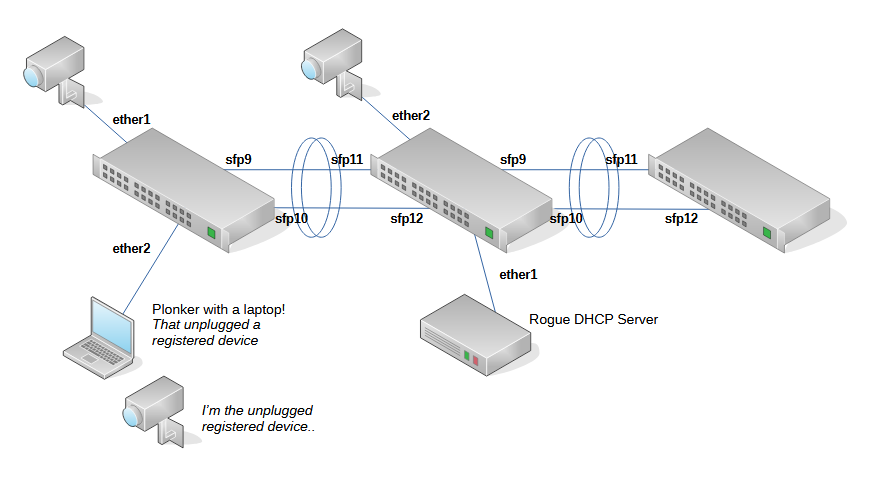 trunk1were incorrectly appearing as learned ontrunk2, breaking DHCP relay.After configuration cleanup and reboots, things stabilized, but this shows the quirks of the hardware. In a production environment where you may have to replace equipment fairly regularly this could be a deal breaker using this type of port level protection.