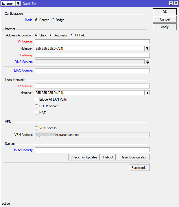 On the left hand side you will see a long list of menu options with even more options on top of more options! (we did say in our article MikroTik Multi Tool Router).. We will first learn the quick way which for a lot of general networks like a BT full Fiber solution or even Lease Line where it's a fully routed network the "cheat" method will do the job! we will start with Quick Set its fairly sell explanatory but we will go throw the different options and how they effect the config on the router.